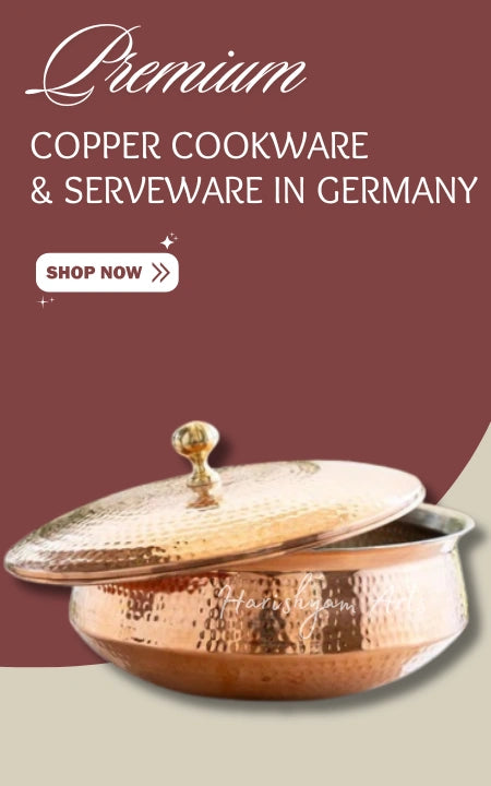 Elevate your kitchen with our premium copper cookware and serveware in Germany. From copper water jugs to hand-beaten copper kadhais, every piece offers both health benefits and aesthetic beauty. Perfect for modern European homes seeking a blend of tradition and functionality, our copper collection brings Indian authenticity to German households.