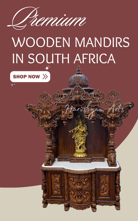 Discover handcrafted wooden pooja mandirs made from premium teak and Sheesham wood, offering durability and timeless beauty. These traditional wooden mandirs are designed to create a serene and spiritual atmosphere in South African homes, blending intricate carvings with superior craftsmanship.